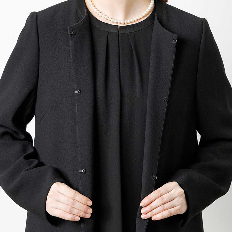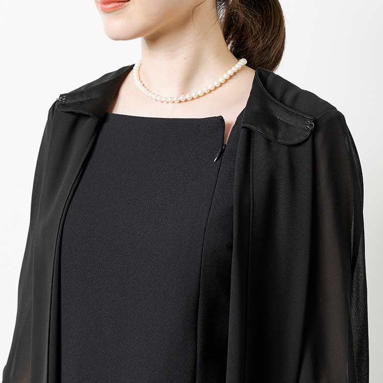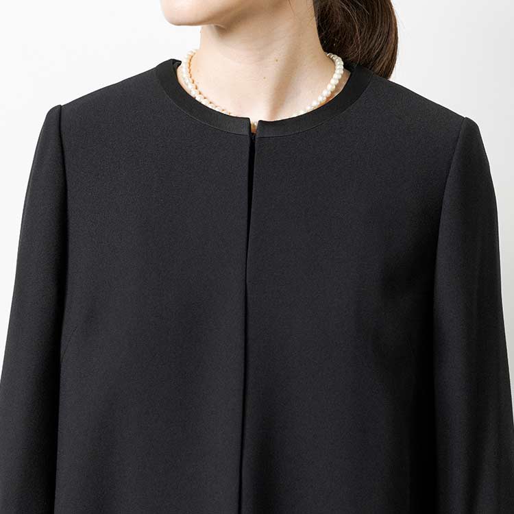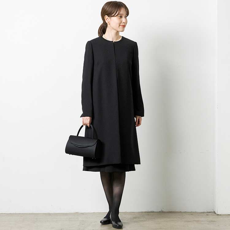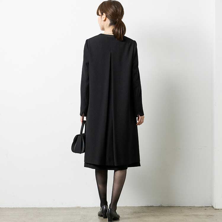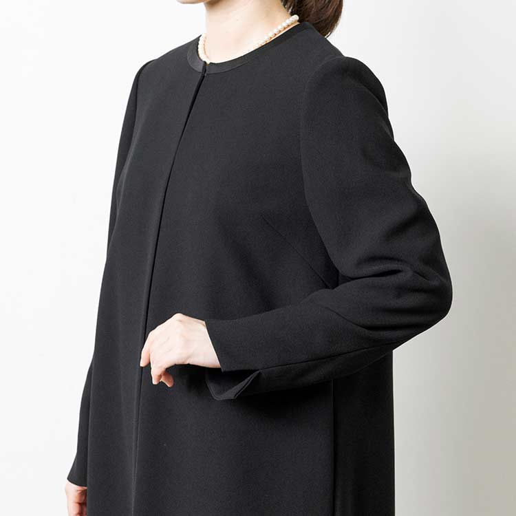 ■ロングジャケット風ワンピースロングジャケットを羽織っているようなワンピース。夏場にはワンピース一枚でも喪のお席にご着用頂けるようなデザインです。