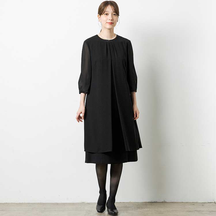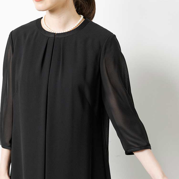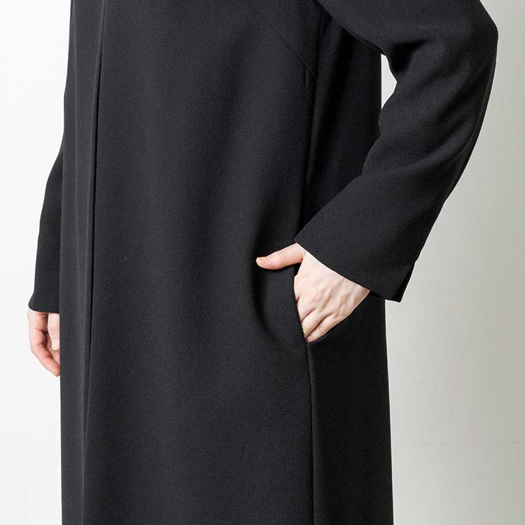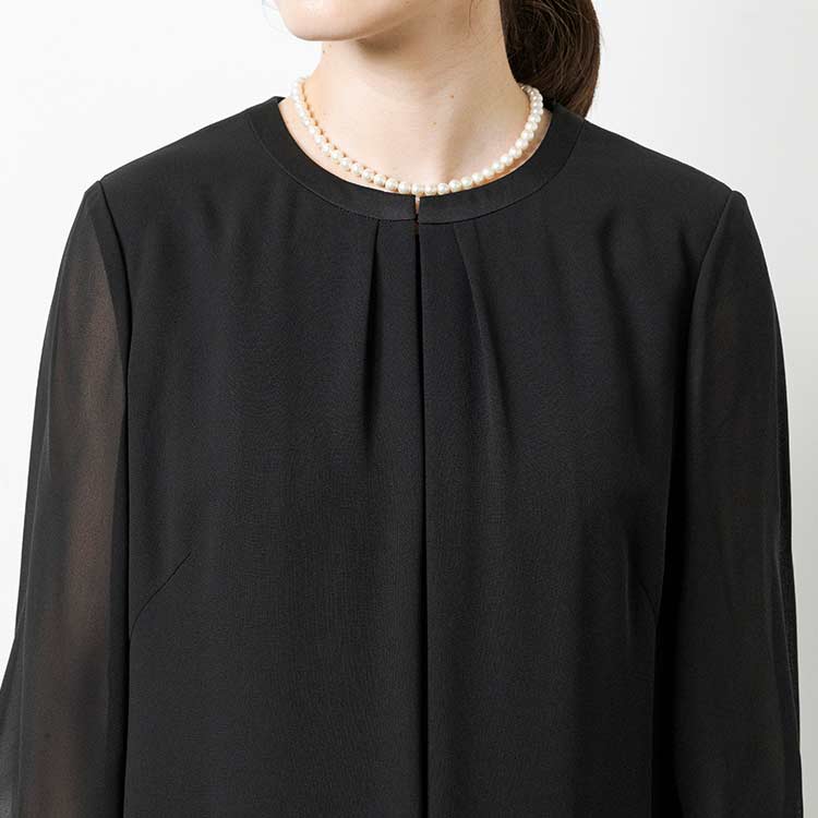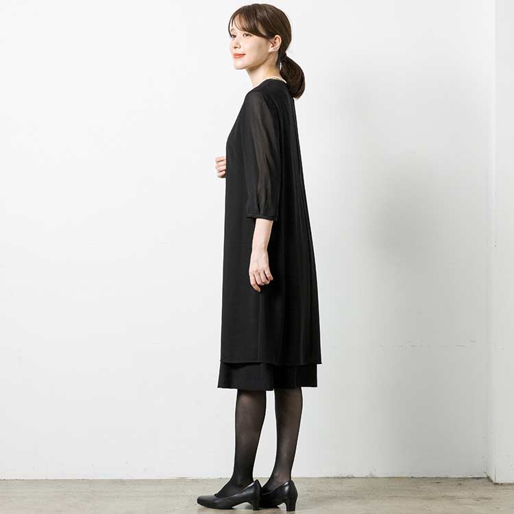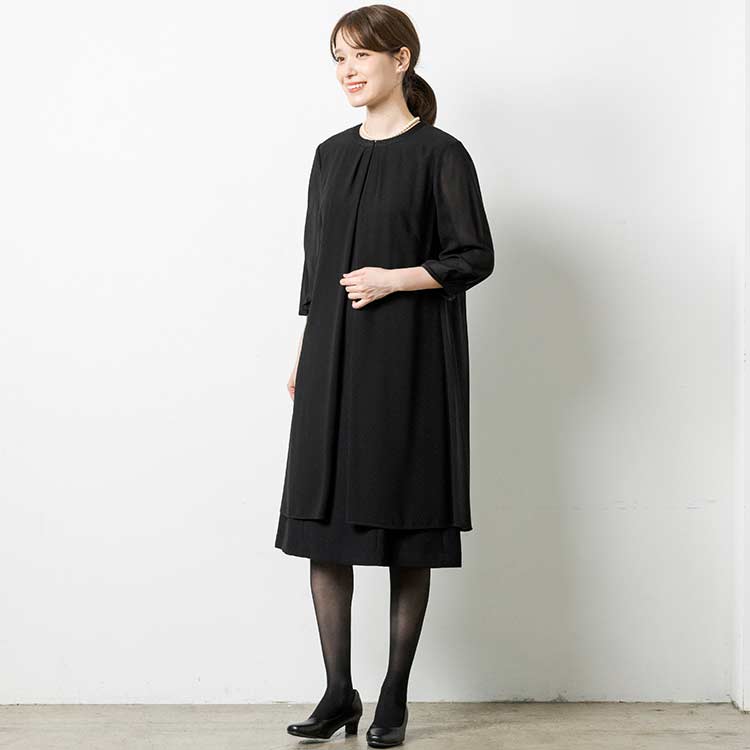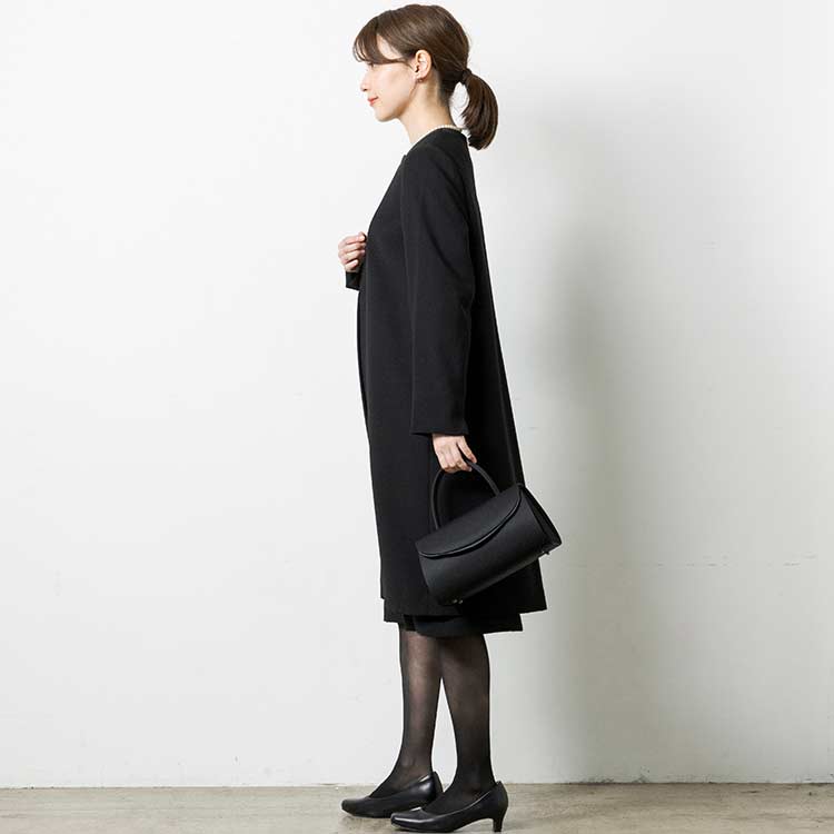 ■ロングジャケット風ワンピースロングジャケットを羽織っているようなワンピース。夏場にはワンピース一枚でも喪のお席にご着用頂けるようなデザインです。